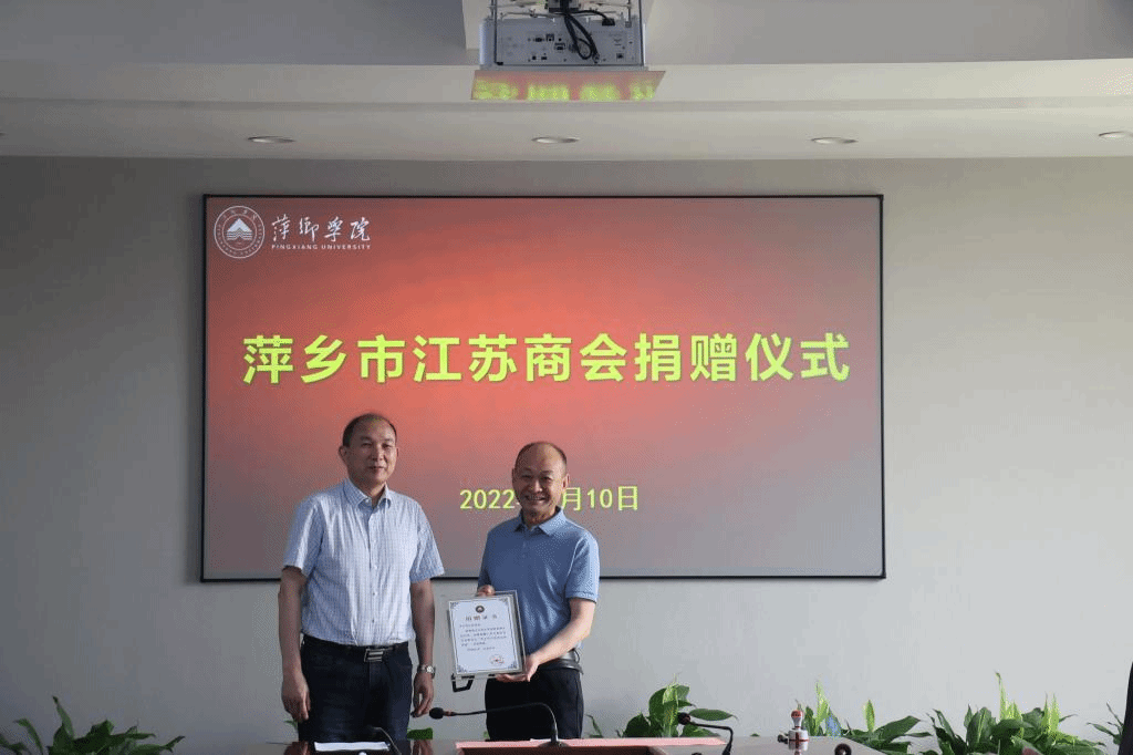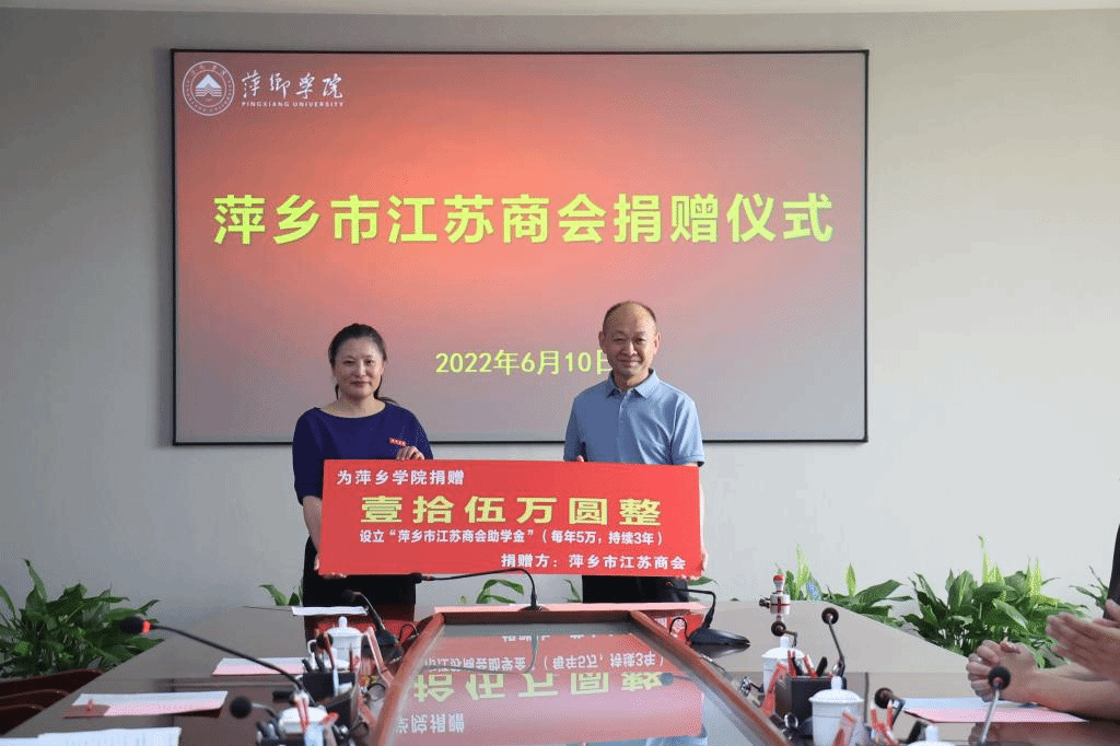 6月10日上午,萍乡市江苏商会捐赠仪式在我校至善楼第二会议室举行。萍乡市工商联副主席欧阳建、萍乡市江苏商会会长张红专、荣誉会长张秋华、执行会长侯建、秘书长孙海峰、支部书记许佳,校党委副书记、校长史焕平,校党委委员田常红,校党委委员、宣传部部长陈永国出席捐赠仪式。计财处、学工处、招就处负责人参加捐赠仪式,捐赠仪式由陈永国主持。
