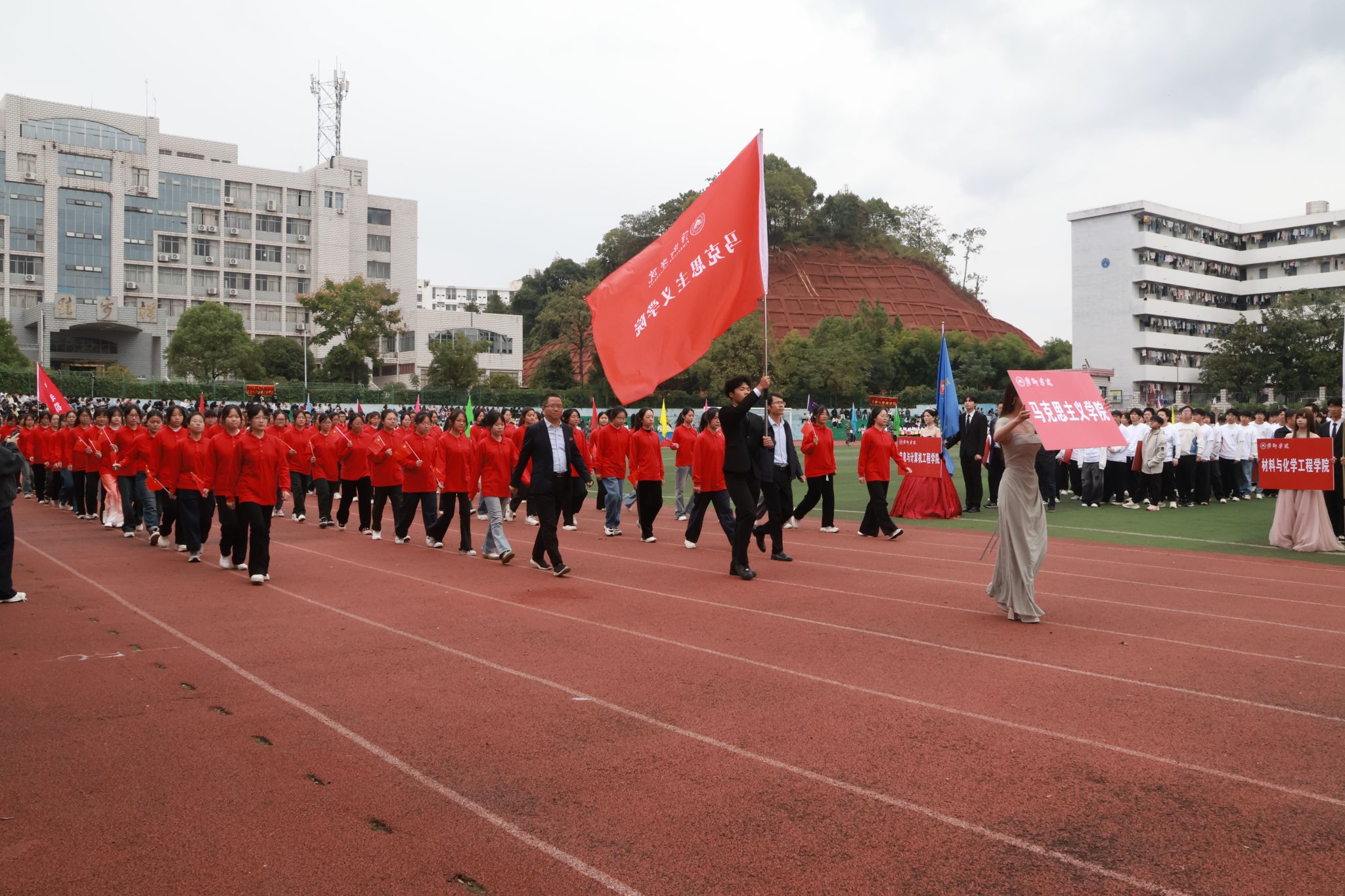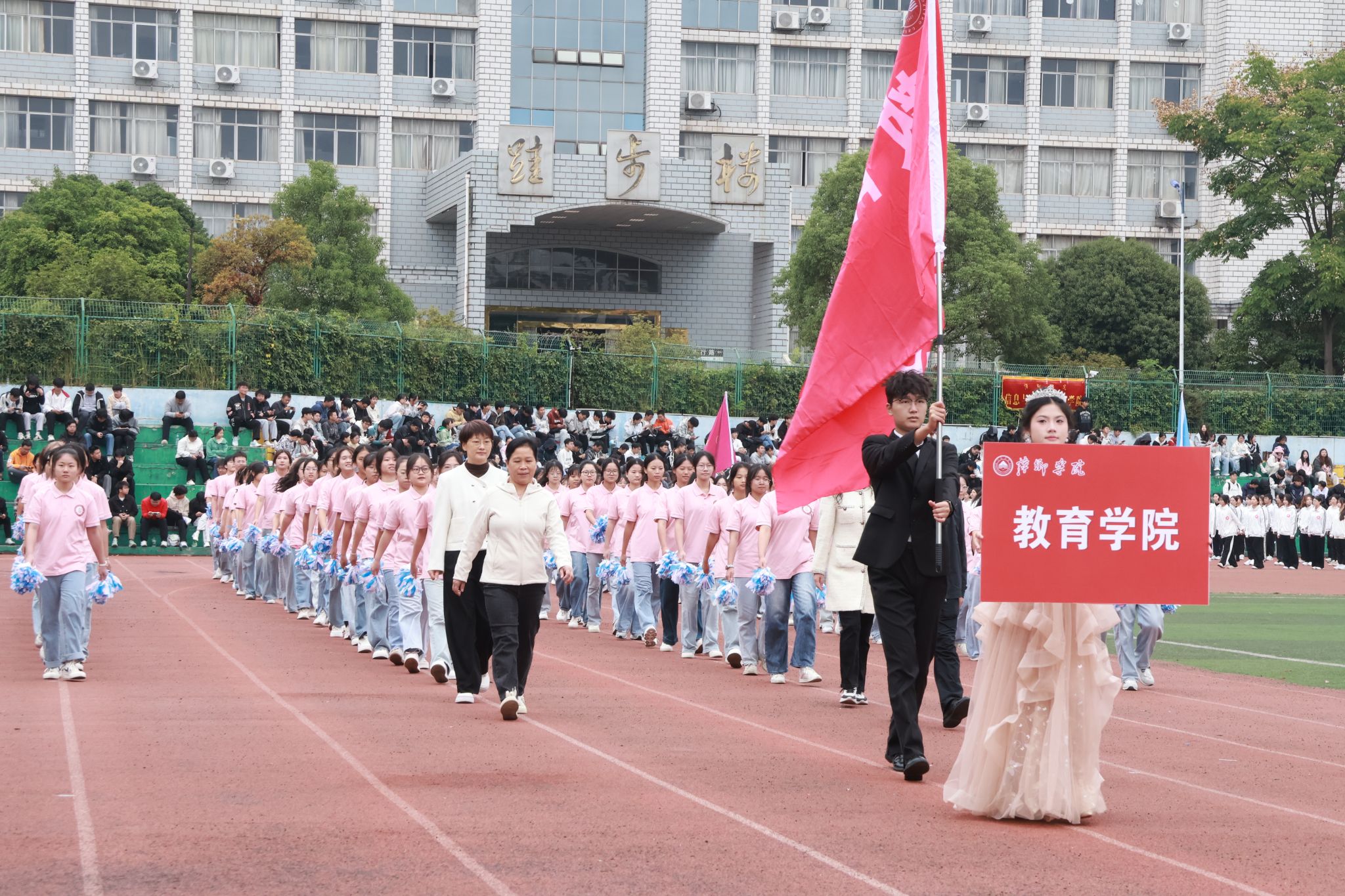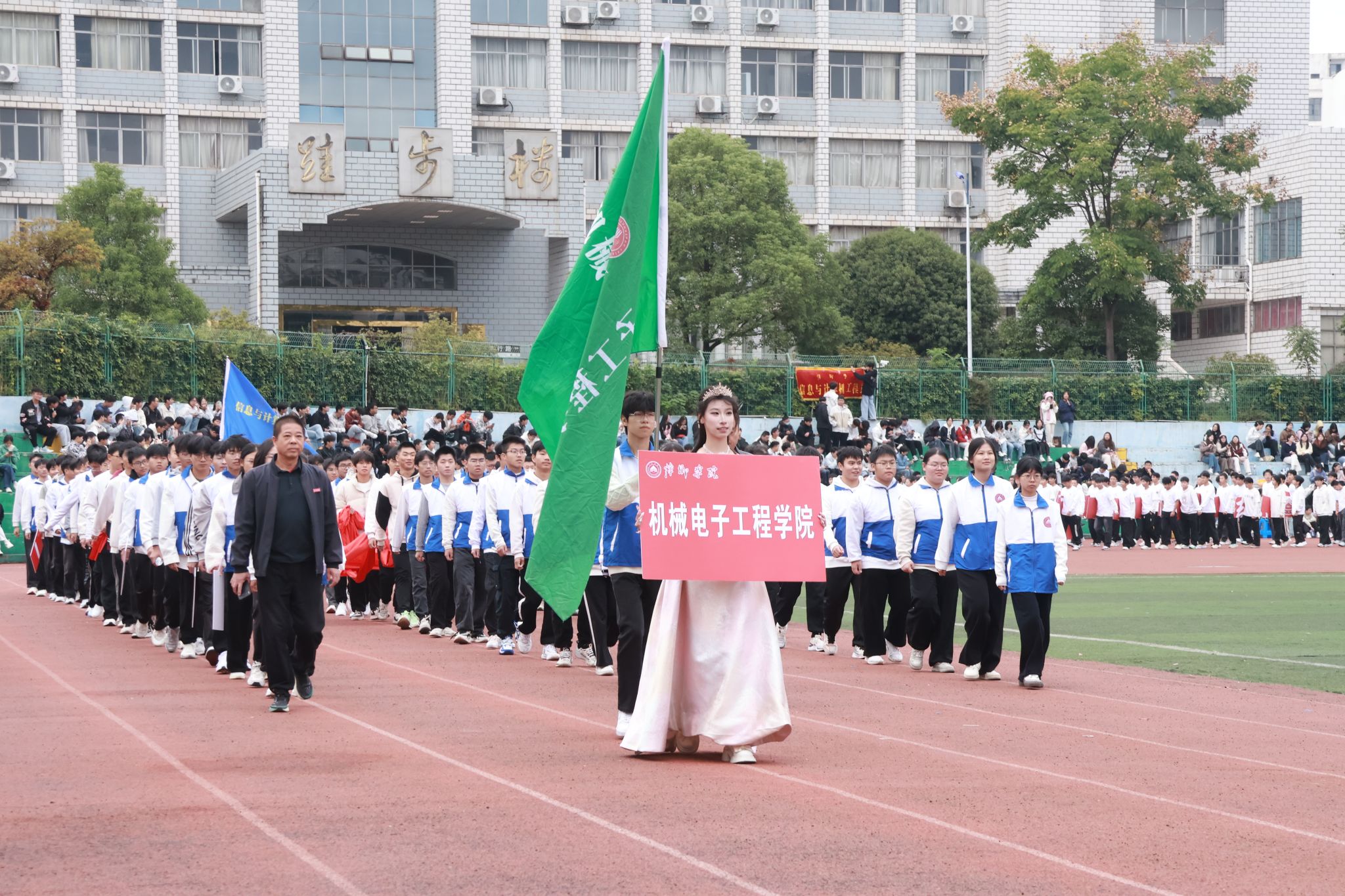 在青春激昂的《运动员进行曲》中,国旗、校旗、会旗方阵率先入场,民兵护校队、运动员、裁判员代表队紧随其后。十一个二级学院代表方阵依次亮相,他们笑容盈面、朝气蓬勃,尽显萍院青春风采。