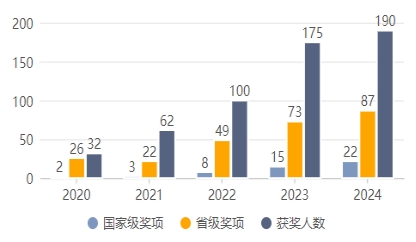 学院高度重视人才培养质量,秉持“以赛促学、以赛促教、以赛促创”的理念,着力提升学生的创新能力与综合素质。学院高质量承办2023年江西省大学生机械创新设计大赛机械创意赛项暨中国大学生机械工程创新创意大赛机械产品数字化设计赛江西省预赛,进一步促进学科竞赛的持续开展,营造良好氛围。近五年来,学院学科竞赛成果显著,学生参与面持续扩大,竞赛成绩不断突破。2020年到2024年,获奖从32人次增长至2024年的190人次,国家级获奖由2项增至22项,省部级奖项由26项提升至87项。