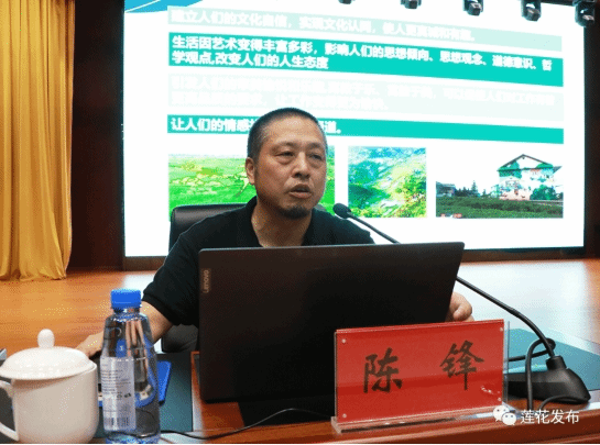 结合丰富的理论实践和大量的典型案例,陈锋围绕“产业升级美、绿色生态美、城乡融合美、百姓生活美、社会风尚美”五个主要方面,深入阐述了艺术在服务经济社会发展中的重要作用。他认为,可以从艺术视角出发,基于美学思维来通盘考虑产业的升级和城乡空间的发展,可以从天际线、城市色彩、城市性格、视觉识别系统等元素着手,升级文旅IP+产业整体形象、产品设计美学、产品包装设计、企业文化等,打造一个被广大群体认可的良好产业形象。要在尊重自然、顺承自然的基础上,因地制宜进行景观生态的的保护和恢复,让自然做功,充分展现莲花的质朴风貌、原生文化、传统习俗,让游客望得见山、看得见水、记得住乡愁。要做到“城乡规划一体化,产业发展一体化,基础设施建设一体化,公共服务一体化,就业市场一体化,社会管理一体化”,推动城镇基础设施向乡村延伸,公共服务和社会事业向乡村覆盖,打通城镇与乡村的资源。要通过对生产空间、生活空间、交流空间、信仰空间、道德空间、商业空间等的艺术设计,提高民众生活品质,实现自身生活美、大家传播美、体验精致美的生活状态。要布局信仰空间,使其体现党的文化荣誉、历史的厚重、精神的博大和思想旗帜的伟大;要重视红色景点打造,使其充满英雄之气、使命之重、信仰之美、崇高之志;要设计交流空间,使其以文化人、成风化俗,凝聚民心、引导群众,创造强大的社会风尚软实力。