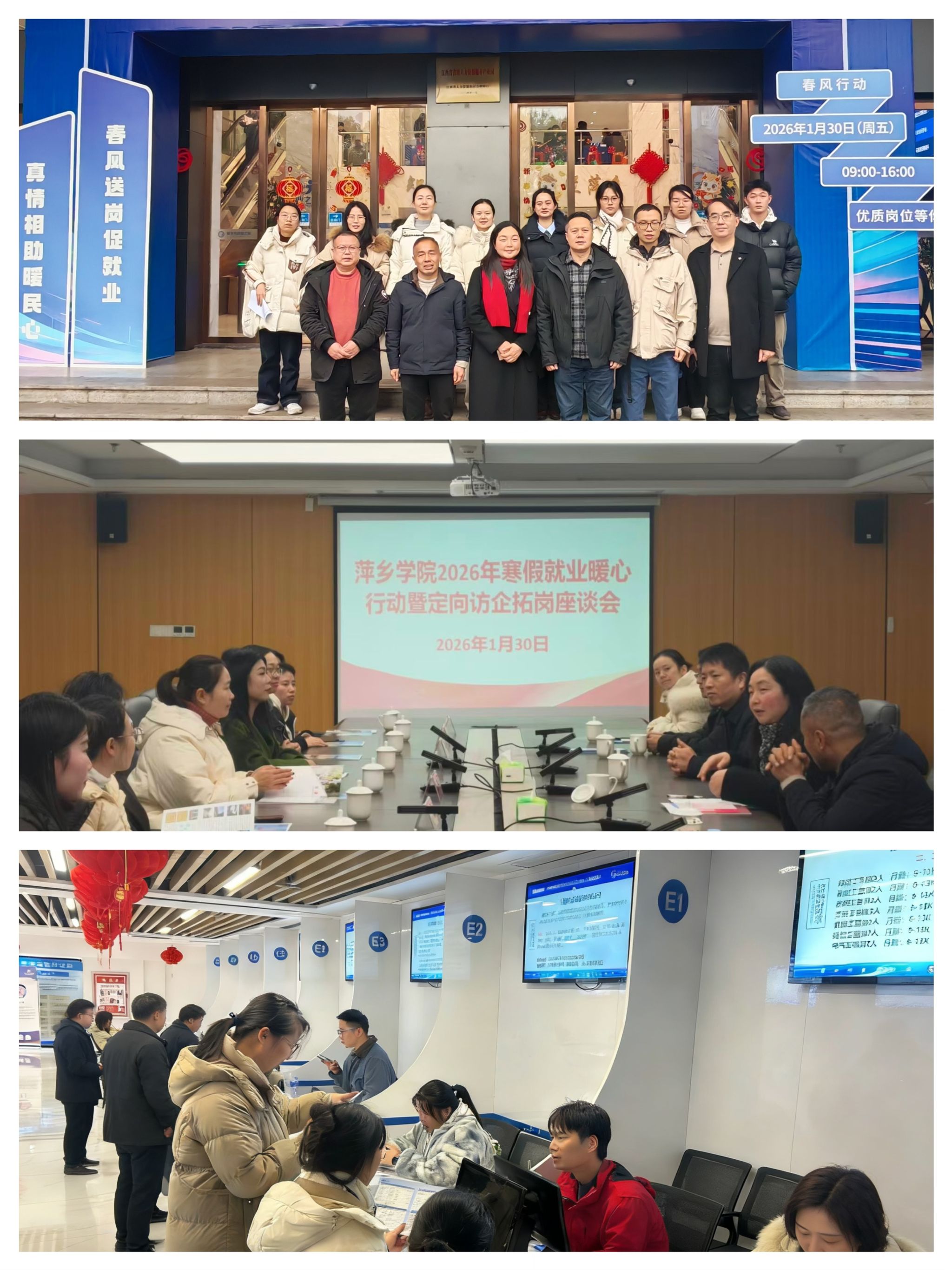 1月30日,我校组织本地毕业生参加萍乡市2026年“春风行动”就业援助暨返乡技能人才专场招聘会。同日,学校专题召开2026年寒假就业暖心行动暨定向访企拓岗座谈会,邀请萍乡德怡科技有限公司、江西百宏光电科技有限公司等十家本地重点企业代表参会,双方围绕人才需求、实习基地建设、产学研合作等进行了深入交流。