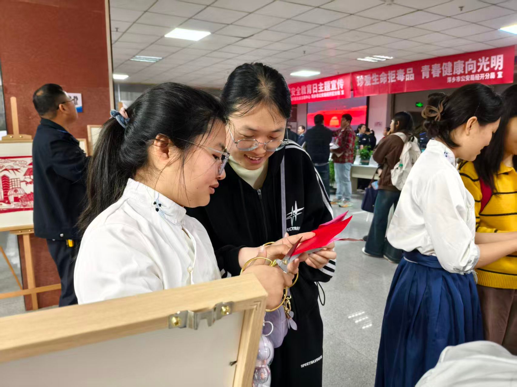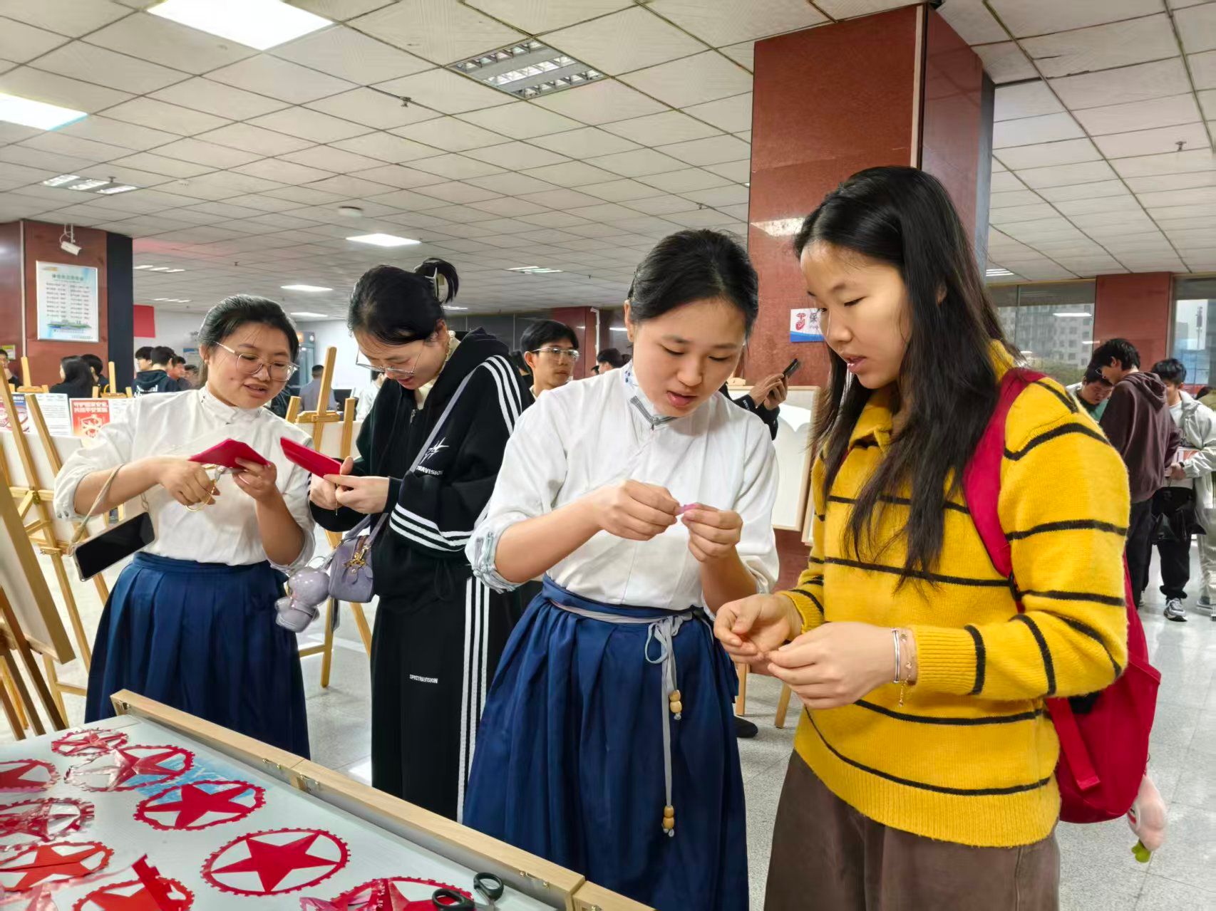 我校的剪纸作品整体以“中国红”为视觉底色,分别聚焦政治、军事、网络、生态等不同安全领域,形成了一道引人入胜的“红色艺术长廊”。现场不少师生或驻足细品作品的精巧构思,或举起手机拍照留念,更有多批不同年龄的参观者在体验区跃跃欲试。一抹抹专注的身影,一双双灵巧的手,让抽象的国家安全理念,在指尖的细微动作中变得可触可感。