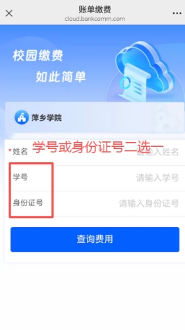 交费途径:1、通过微信扫码进入缴费界面,学号或身份证号二选一;2、微信关注萍乡学院服务号(用于费用收取),快速缴费,无需登录。