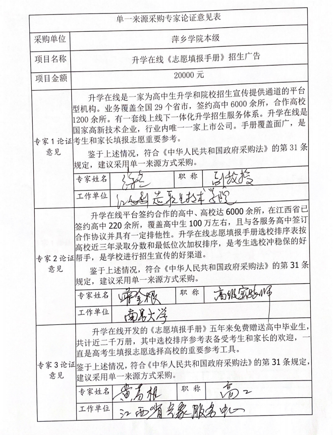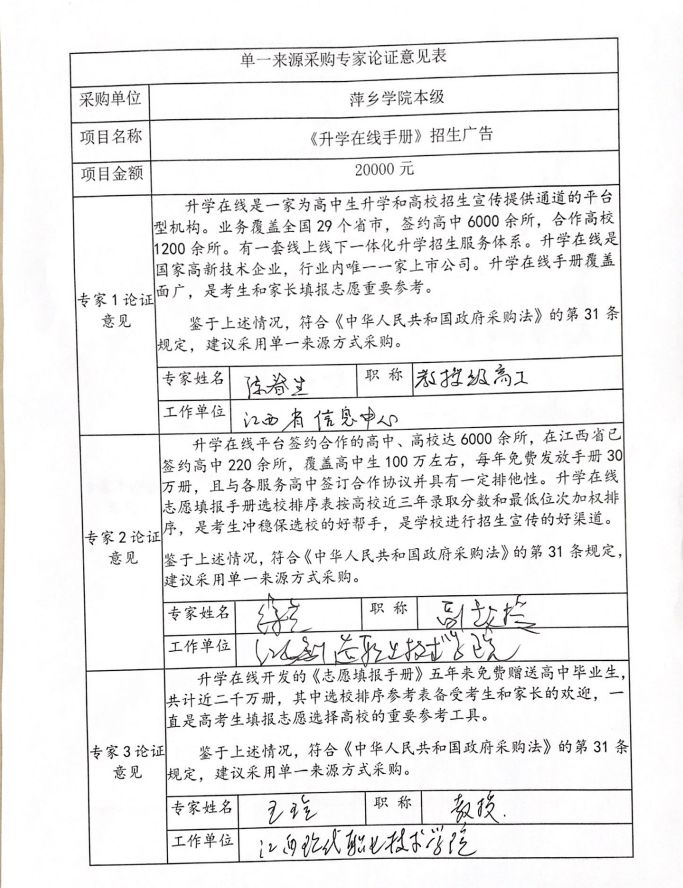 萍乡学院2020年升学在线手册招生广告专家论证意见表
