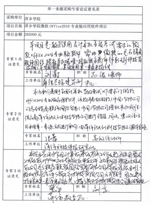 萍乡学院微软Office2016专业版应用软件采购项目采用单一来源方式采购。该项目拟由萍乡市新天创科技有限公司提供服务,现将有关情况向潜在政府采购供应商征求意见。征求意见期限从2021年1月 12日起至2021年 1月19日止。潜在政府采购供应商对公示内容有异议的,请于公示期满后两个工作日内以实名书面(包括联系人、地址、联系电话)形式将意见反馈至萍乡学院采购办公室(联系电话:0799-6682697, 地址:江西省萍乡市萍安北大道211号),联系人:彭先生,联系电话:0799-6682697)。