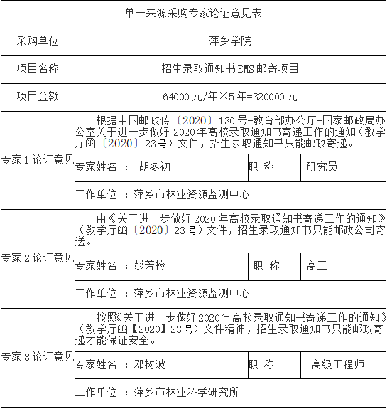 招生录取通知书EMS邮寄项目采用单一来源方式采购,该项目拟由中国邮政速递物流股份有限公司萍乡市分公司提供服务,现将有关情况向潜在政府采购供应商征求意见。征求意见期限从2021年 04月 29日起至2021年04月 30日止。潜在政府采购供应商对公示内容有异议的,请于公示期满后两个工作日内以实名书面(包括联系人、地址、联系电话)形式将意见反馈至萍乡学院招标与采购中心(联系电话:0799-6682697, 地址:江西省萍乡市萍安北大道211号),联系人:彭老师,联系电话:0799-6682697)。