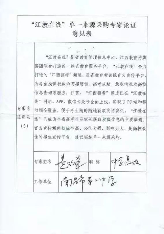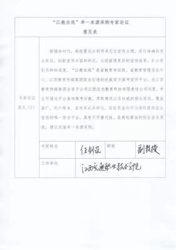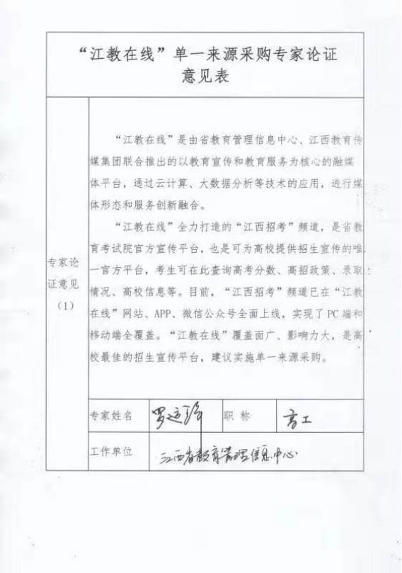 萍乡学院“江教在线”招生宣传项目采用单一来源方式采购。该项目拟由江西汉光教育科技有限公司提供服务,预算金额6万一年,服务期3年,总计18万.现将有关情况向潜在政府采购供应商征求意见。征求意见期限从2021年5月 8日起至2021年 5月14日止。潜在政府采购供应商对公示内容有异议的,请于公示期满后两个工作日内以实名书面(包括联系人、地址、联系电话)形式将意见反馈至萍乡学院招标与采购中心(联系电话:0799-6682697, 地址:江西省萍乡市萍安北大道211号),联系人:彭老师,联系电话:0799-6682697)。