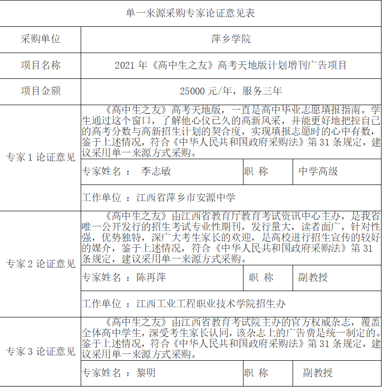 2021年《高中生之友》高考天地版计划增刊广告项目采用单一来源方式采购,该项目拟由江西省教育考试资讯中心提供服务,现将有关情况向潜在政府采购供应商征求意见。征求意见期限从2021年 5月 24日起至2021年5月31日止。潜在政府采购供应商对公示内容有异议的,请于公示期满后两个工作日内以实名书面(包括联系人、地址、联系电话)形式将意见反馈至萍乡学院招标与采购中心(联系电话:0799-6682697, 地址:江西省萍乡市萍安北大道211号),联系人:彭老师,联系电话:0799-6682697)。