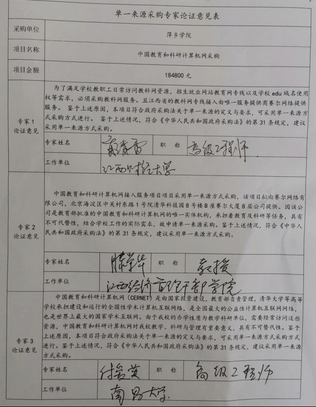 中国教育和科研计算机网采购项目采用单一来源方式采购。该项目拟由赛尔网络有限公司提供服务,现将有关情况向潜在政府采购供应商征求意见。征求意见期限从2021年6月 15日起至2021年6月23日止。潜在政府采购供应商对公示内容有异议的,请于公示期满后两个工作日内以实名书面(包括联系人、地址、联系电话)形式将意见反馈至萍乡学院采购办公室(联系电话:0799-6682697, 地址:江西省萍乡市萍安北大道211号),联系人:彭老师,联系电话:0799-6682697)。