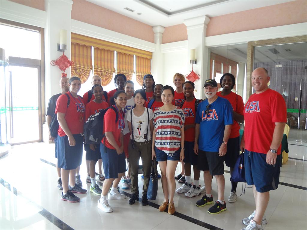 图为张洋睿、王翡两位教师与美国WNBA职业联队教练、队员合影
