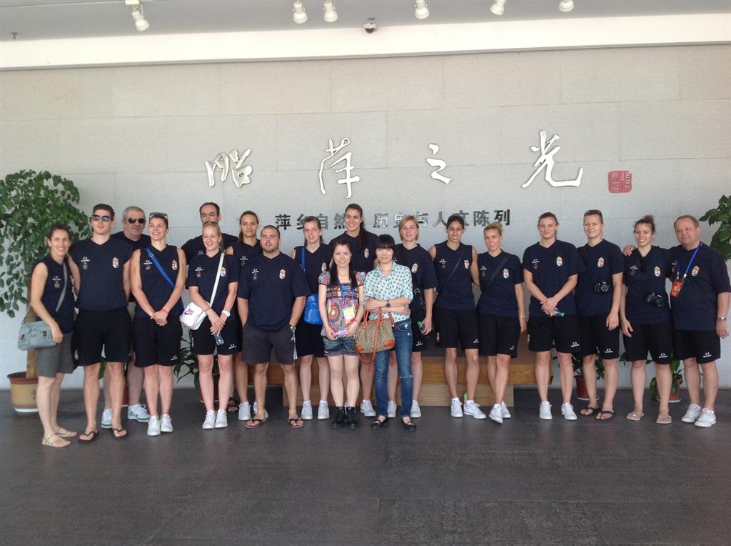 图为肖福兰、肖莉两位教师带领匈牙利国家女篮全体教练、队员参观萍乡市博物馆。