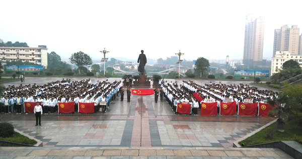 在中华人民共和国成立64周年之际,9月30日上午7时,校团委在升旗广场举行了“向国旗致敬”活动。校级学生组织学生干部以及各系(部)团总支负责人、各班班长、团支部书记近千人参加了此次活动。