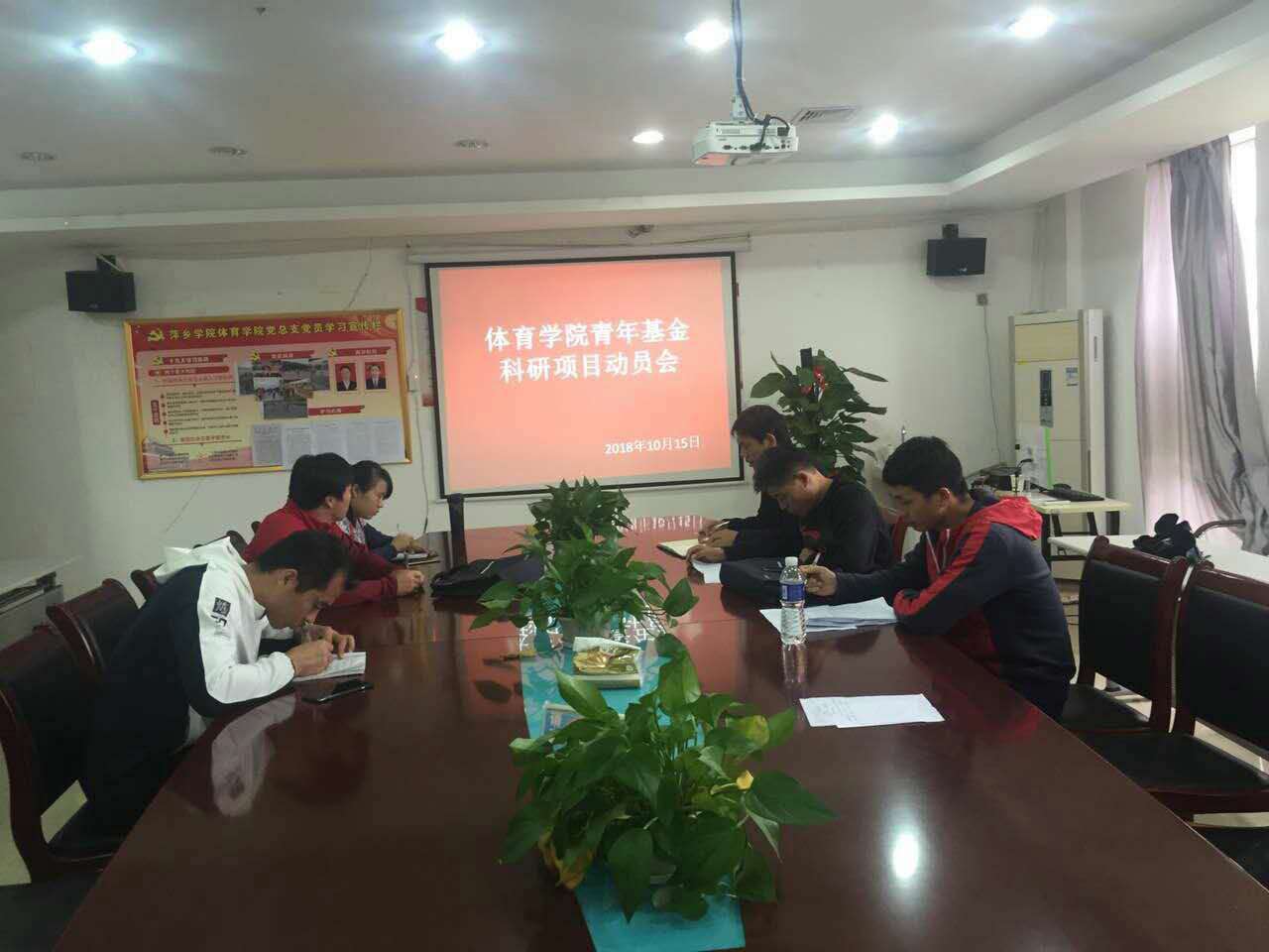 10月15日,体育学院在二楼会议室召开2018年度青年科研基金项目动员会,本次会议由体育学院教学科研科长严五四主持,本院符合条件的青年教师均参加了动员大会。