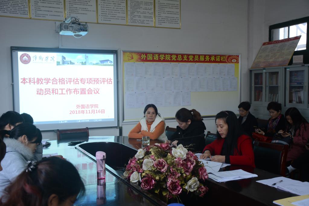 为了迎接学校本科教学合格评估专项预评估工作,查找在评建工作中存在的问题与差距,确保2019年评估工作顺利进行,外国语学院在院会议室召开了本科教学合格评估专项预评估动员和工作布置会议。会议由外国语学院院长欧阳咏梅主持,外国语学院全体教职工参加了此次会议。