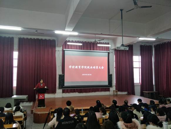 为指导2014级学前教育专业毕业生更好地开展职业规划,把握就业机会,优质就业,2019年3月5日下午4点,学前教育学院在跬步楼1115教室隆重召开2014级学前教育专业毕业生就业动员大会。出席本次大会的有萍乡学院招生就业处处长文发佑、学前教育学院党总支书记胡艳维、院长邱仁根、副书记阳学文、副院长彭香萍、学生科刘飏华、王琨老师以及2014级370名学生。大会由14级学前教育7班张怡情同学主持。