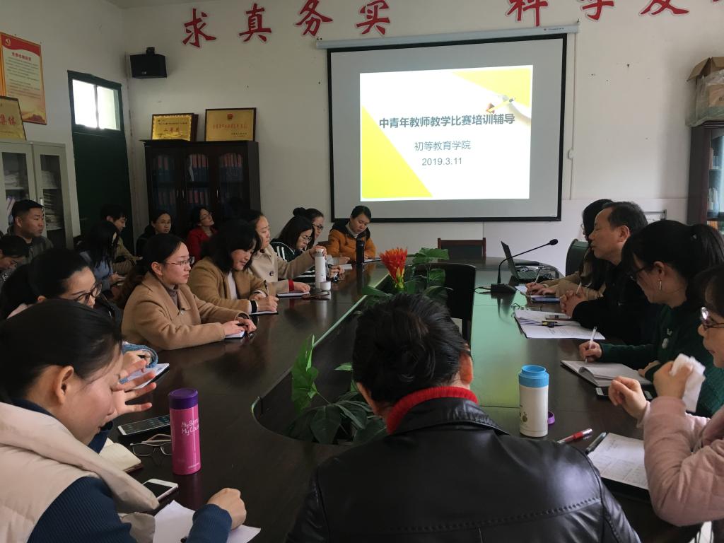 为进一步检验和提升我院中青年教师的教学水平,提高人才培养质量,为广大中青年教师搭建互相交流、学习、展示教学风采的平台,初等教育学院计划于2019年4月份举办中青年教师教学比赛。为了让所有参赛教师能够充分了解此次比赛,并为此做好充分准备,初等教育学院于2019年3月11日中午1:00举办了教师教学比赛培训。此次培训由在学校教学比赛中取得优异成绩的徐海燕老师主讲。