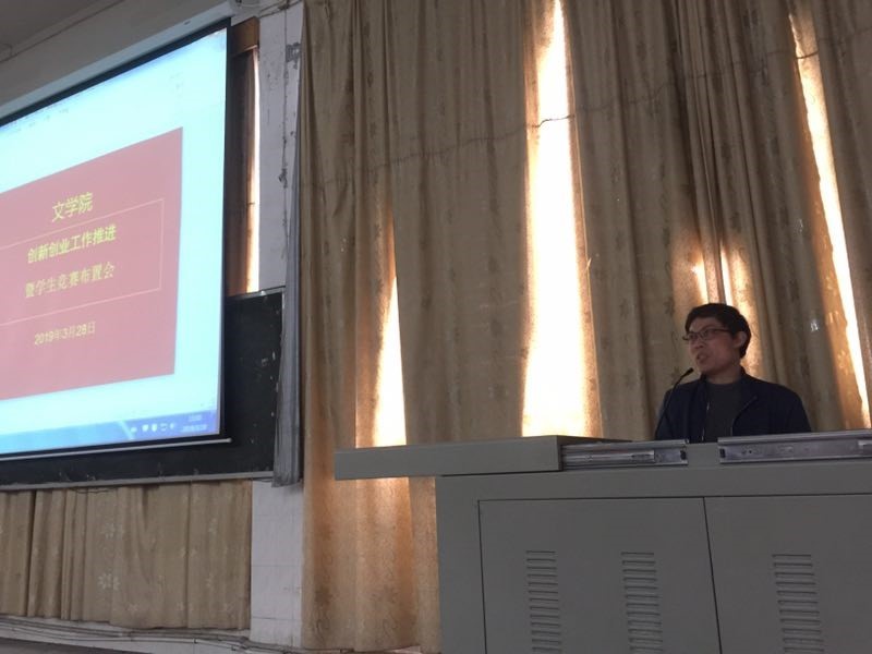 为激发当代大学生创新精神,培养当代大学生创业能力,文学院特于3月28日中午13点,在跬步楼1101教室举行了创新创业工作推进会暨学生竞赛布置会活动。与会领导有文学院院长易志文、党总支副书记孙琦、副院长郭慧、创新创业院副院长谢伟萍、文学院教学科研科科长孙海龙以及陈晓、李小叶、赵凡、谢欢等几位指导老师。文学院17中本班、18中本班以及18广编班所有学生参加了此次会议。会议由郭慧老师主持。