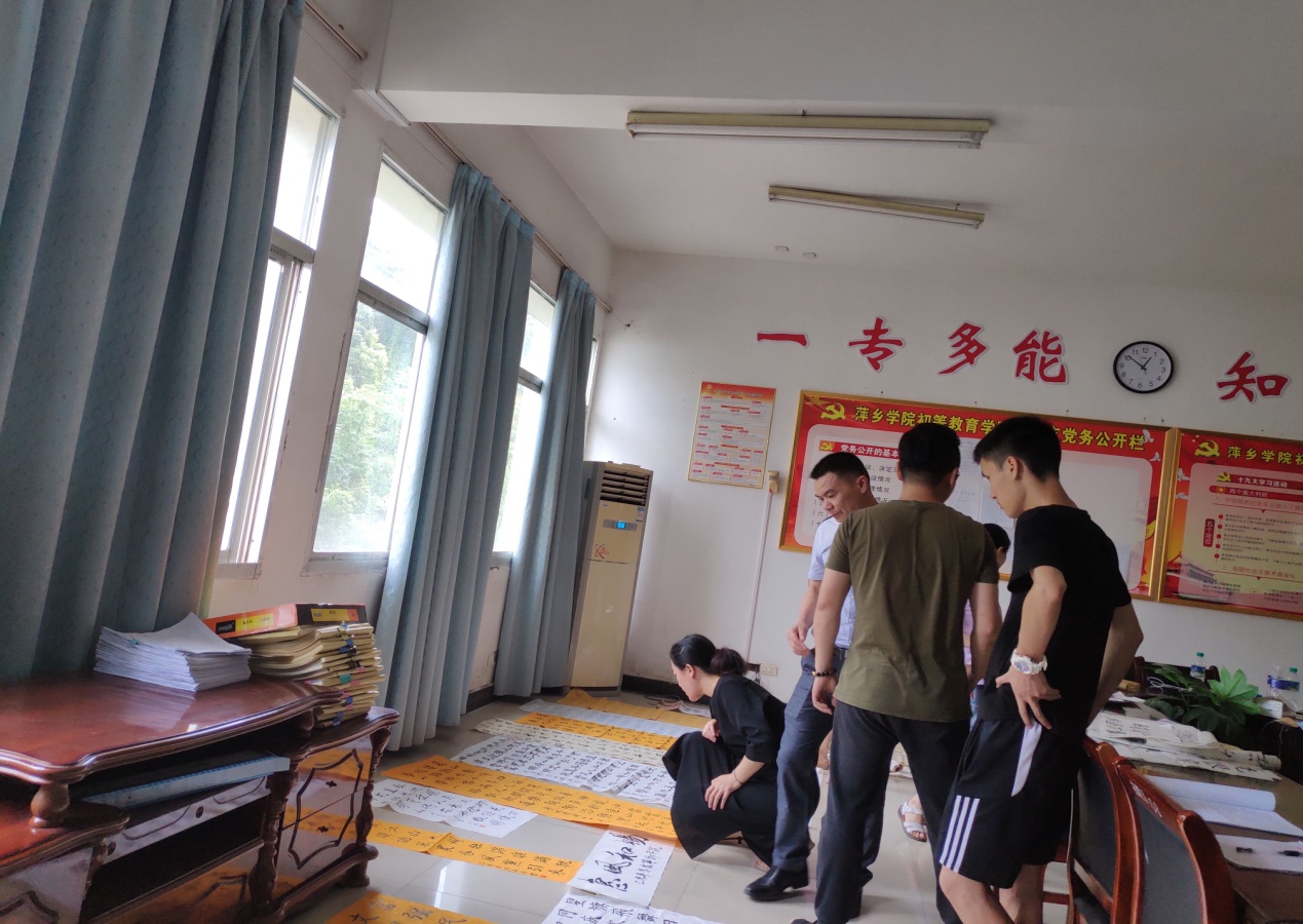 6月20日中午12:40左右,各位评委老师到达书画专场评选地点院会议室。映入眼帘有颜筋柳骨,矫若惊龙,力透纸背的大、中楷,以及美女簪花,如锥画沙的小楷,还有行云流水,鸾漂凤泊的行草书,都将同学们扎实的书法功底展现得淋漓尽致。与此同时,手抄报组也不甘示弱。许多作品不仅文字与绘图相映成趣,使人有心旷神怡之感,且标题醒目突出,内容紧扣主题,版面设计别有风味。评委老师们对各班推选上来的作品进行了认真的评选。