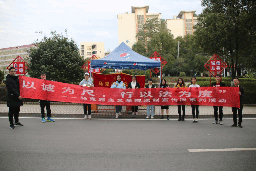 2019年12月1日组织全体新生在跬步楼1109观看法制影片《十二公民》。影片主线围绕一起“富二代弑父案”展开,悬而未决的案子、定罪量刑的裁量、虚拟陪审团成员们激烈的讨论辩驳将观影同学带入跌宕起伏的情节中,主角们对案件的分析探讨给同学们留下了深刻的印象,它糅合了中国的社会百态。2019年12月2日上午,在跬步楼1111教室举办了2019年“宪法宣传周”系列活动之法制教育专题讲座,主题为“崇尚理性消费,避免网贷危机”专题讲座,由马克思主义学院法律教研室罗骞老师为全体大一新生讲授。2019年12月3日我院在模拟法庭举办了2019年“宪法宣传周”系列活动之模拟法庭审判活动。参与本次活动的人员有钱力老师和17法律、18法律部分同学。2019年12月4日我院在宜萱楼前举行宪法晨读活动。我院党总支副书记江惺俊、团总支书记陈尧嘉以及部分学生代表参与本次晨读活动,此次活动由马克思主义学院团总支学生分会学习部部长黄佳主持。我院于2019年12月4日国家宪法日当天在学院中心小广场设点,举行了“国家宪法日”宣传横幅签名、法律知识问答活动,师生代表应萍乡市司法局邀请,参加了由萍乡市市司法局主办的行政机关第二届开放日活动,此次活动主题是“弘扬宪法精神、推进国家治理体系和自理能力现代化”。
