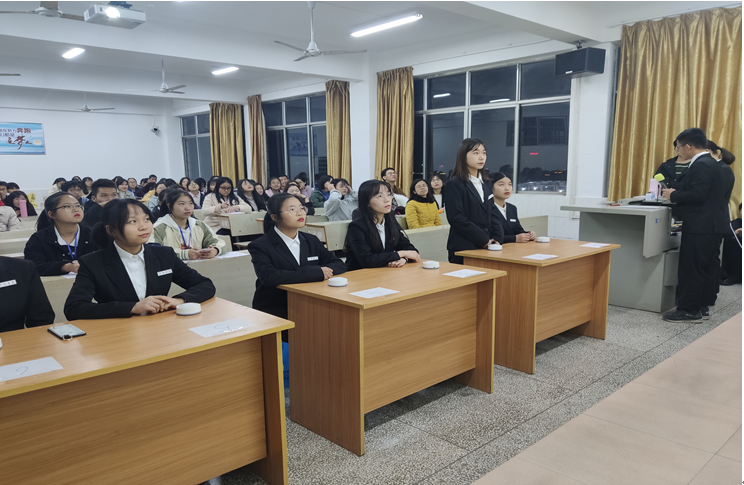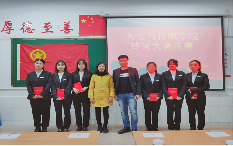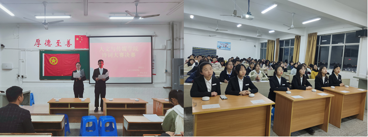 12月11日晚19:00,人文与传媒学院于跬步楼1506教室举行2019年诗词大会决赛。大会特邀文传学院团总支书记黄如光老师、李小叶老师出席,参赛选手为文传学院18级、19级学生,文传学院18、19级各班级代表观赛。本次诗词大会决赛由刘瑾和胡达锋同学担任主持。