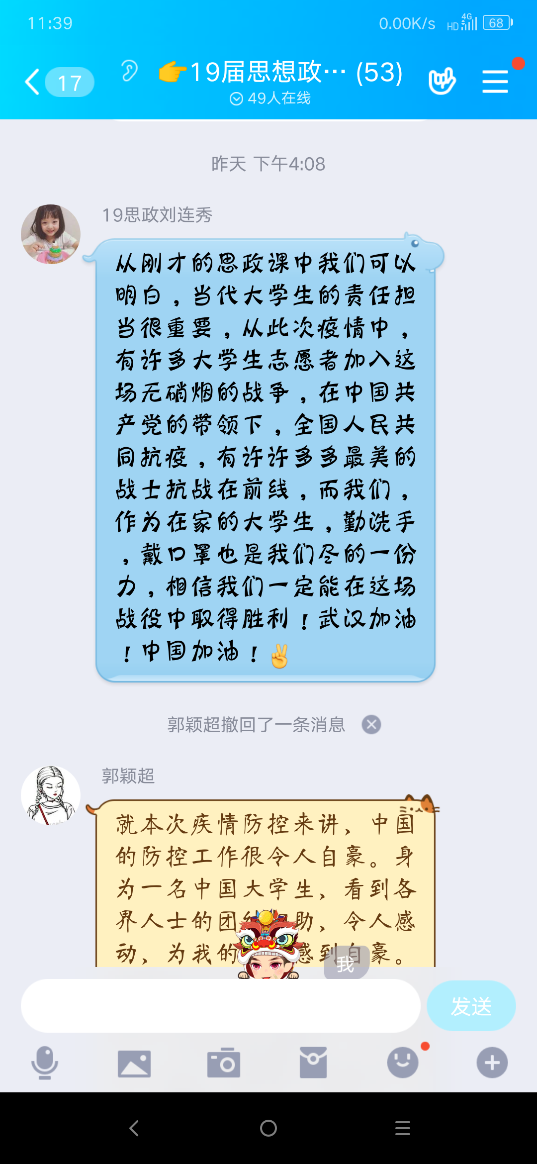 19思政常玉珍:山川异域,风月同天。这一场战斗是人类共同的战役,中华民族依然屹立,在伟大的中国共产党领导之下,敢于面对短板和不足,从中吸取经验教训,在具有新的历史特点的伟大斗争中,我们每一个人要为中华民族伟大复兴作出更大的贡献,让中华民族为世界树立典范。作为青年,拥有着担当,我们不应辜负这伟大的时代,在这场疫情大考中,不仅仅要响应国家号召,更要抓住这次机会让自己成长,从各个方面学习到更多,做更有利于自己、更有利于家庭、更有利于学校、更有利于社会的青年!