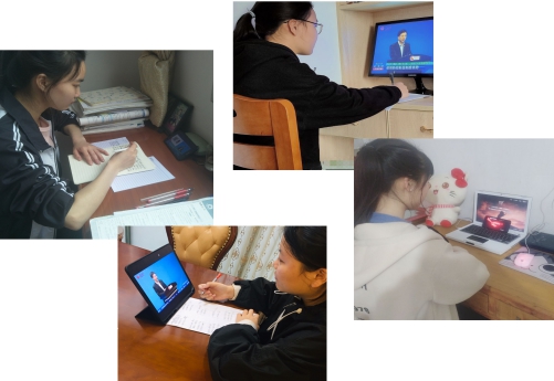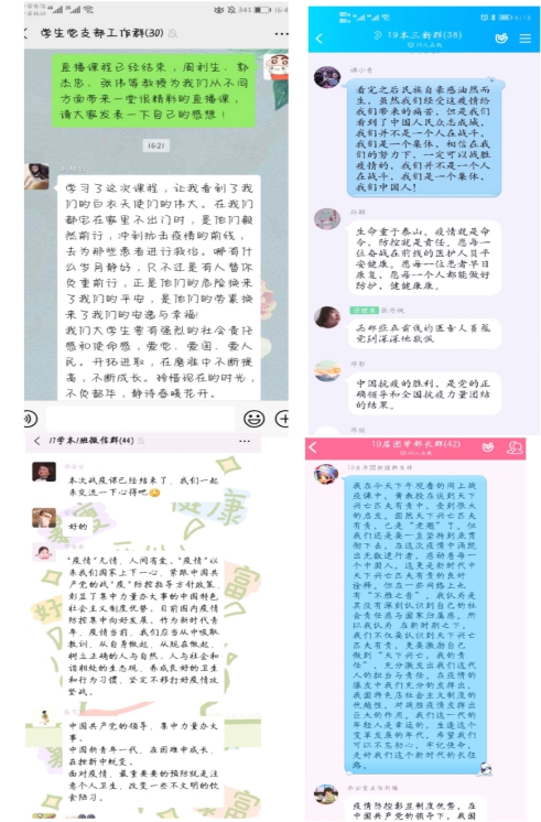 我院学生分散在全国各地,通过电视、手机、电脑等不同方式上课,在同一时间听着同样的话,地域之间的距离被无限缩短,只隔一屏。课程结束后,同学们还通过在线讨论的方式表达自己的心声,并坚信没有一个冬天不会过去,没有一个春天不会到来。在讨论群中,同学们从讨论“天下兴亡,匹夫有责”的信念开始,到最后表明对“疫情防控彰显制度优势”认同,都表明了自身不断努力奋斗的决心以及坚定抗击疫情的信心,并纷纷表示用行动弘扬抗“疫”正能量、做好战“疫”宣传员。