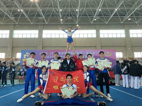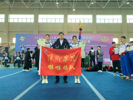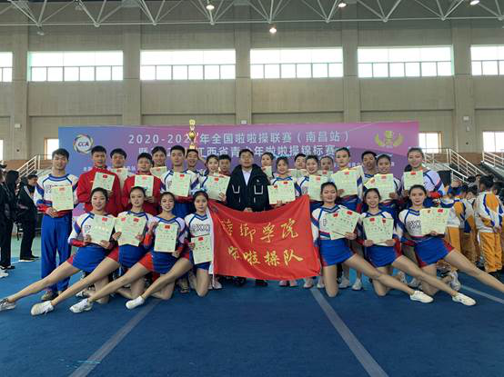 2020年11月29日上午,由国家体操运动管理中心主办,全国啦啦操委员会,江西省体育局,江西省啦啦操委员会联合承办的2020-2021年全国啦啦操联赛(南昌站)比赛落下帷幕,本次比赛一共有50多支代表队,共计大约2000余人参加,各队伍齐聚一堂,激情绽放,为大家带来一场啦啦操的视觉盛宴。我校焰火啦啦操队在教练李军老师的带领下,不负众望,脱颖而出,共派出25名运动员参加了4个项目的比赛,累计获得3金一银的好成绩.