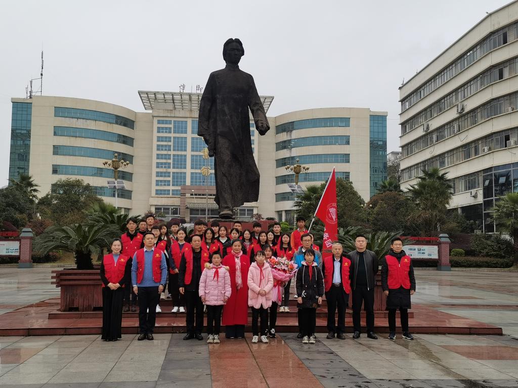 校党委委员田常红为肖玉玲老师献上一束鲜花并致辞。田常红指出,“玉玲志愿服务团”的建立灵感来源于“全国见义勇为英雄模范”肖玉玲舍身救人的英雄事迹,志愿者们应以肖玉玲为榜样,向她看齐。希望大家在“玉玲志愿服务团”的领导下,能够对“奉献、友爱、互助、进步”的志愿者精神有更深的认识,并不断弘扬雷锋精神和安源精神。成立仪式的最后一项议程是“玉玲志愿服务团”团长仇树成带领志愿者进行宣誓。志愿者们的宣誓声响彻整个广场,在每个人的心中久久回响。最后,领导、嘉宾及志愿者们共同合影留念,志愿服务的精神在这一刻定格。