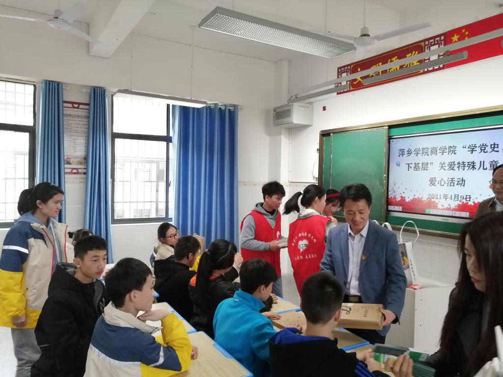 2021年4月9日下午,商学院党总支书记曾敏一行赴芦溪特校组织开展“学党史,下基层,关爱特殊儿童”志愿服务活动,实地考察萍乡学院义工团志愿服务定点合作单位,现场完成特殊儿童的微心愿。商学院及义工团师生代表共计10人参加此次活动。