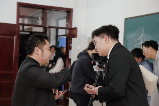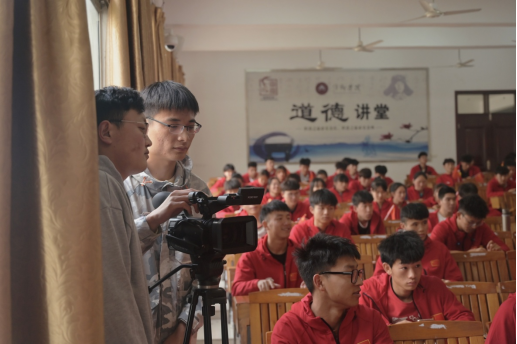 本次活动正式拍摄由摄像组的三台固定机位和两个移动机位进行,固定机位与移动机位相互配合,根据策划组的分镜头脚本有序进行拍摄。拍摄现场,教师易茜解决学生存在问题,指导工作;各小组相关人员各司其职,团结协作,活动展开非常顺利。