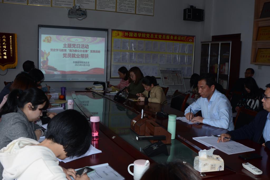 为深入贯彻落实党中央脱贫攻坚的战略任务,帮助建档立卡家庭毕业生树立正确的就业观,实现顺利就业,进一步贯彻落实我院党史学习教育,开展好“我为师生办实事”实践活动。外国语学院党总支于2021年4月20日下午,在英华楼3319党员活动室,进行了“主题党日”活动暨党史学习教育“我为群众办实事”实践活动党员就业帮扶工作会议。会议由外国语学院党总支副书记刘佳萍主持。全体党员及就业帮扶指导教师参加。