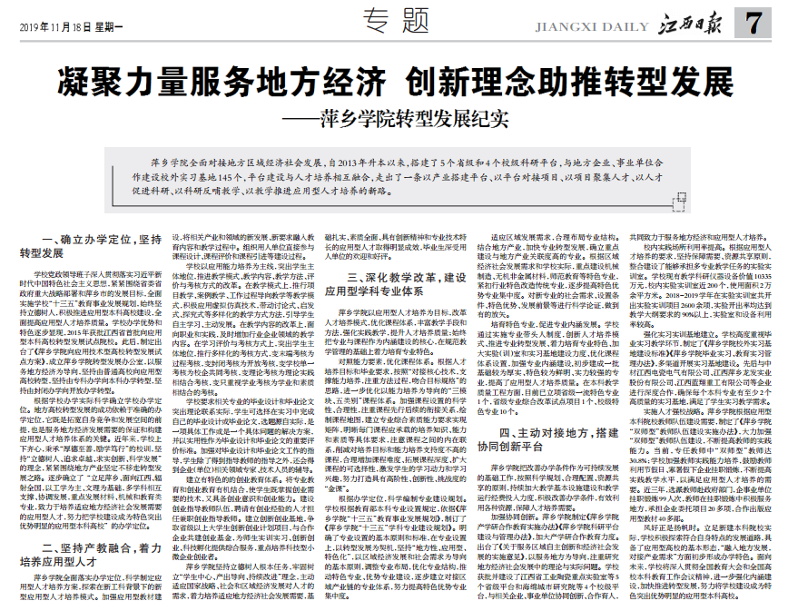 萍乡学院全面对接地方区域经济社会发展,自2013年升本以来,搭建了5个省级和4个校级科研平台,与地方企业、事业单位合作建设校外实习基地145个,平台建设与人才培养相互融合,走出了一条以产业搭建平台、以平台对接项目、以项目聚集人才、以人才促进科研、以科研反哺教学、以教学推进应用型人才培养的新路。