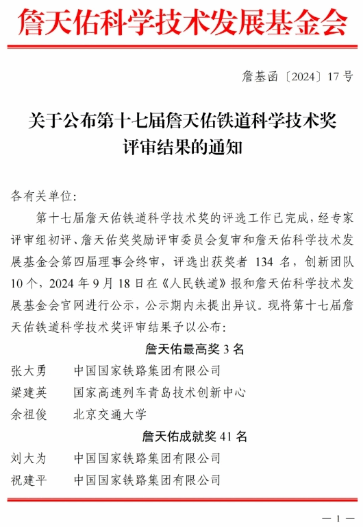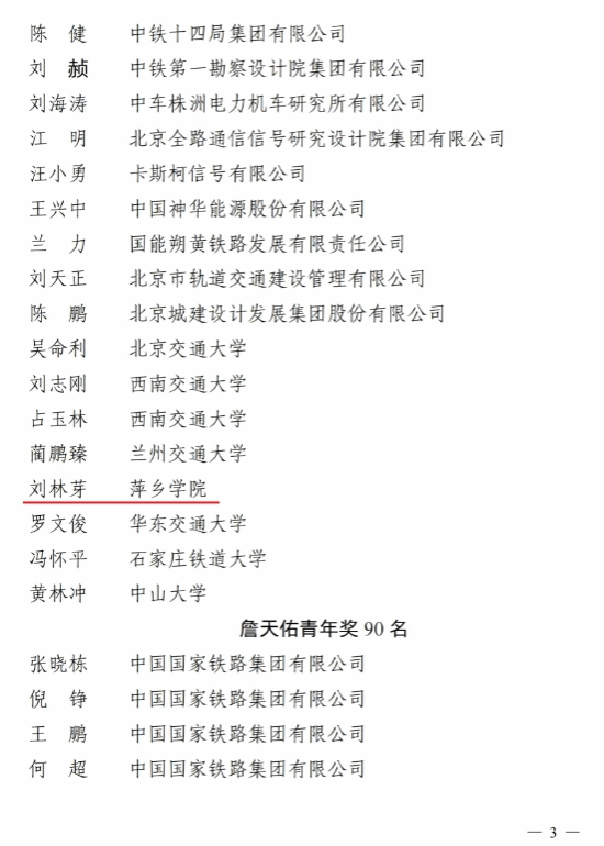 近日,第十七届詹天佑铁道科学技术奖评审结果公布,经专家评审组初评,詹天佑奖奖励评审委员会复审和詹天佑科学技术发展基金会第四届理事会终审,评选出获奖者134名,创新团队10个。其中,民盟省委会副主委、萍乡学院院长刘林芽荣获詹天佑成就奖。